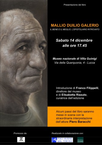 Lucca, sabato 14 dicembre 2019 alle 17.45 al Museo nazionale di Villa Guinigi sarà presentato per la prima volta a Lucca il libro Il bene e il meglio. L'epistolario ritrovato di Mallio Duilio Galerio. Dopo il successo della presentazione di Firenze, Piero Baracchi, regista e attore, torna con la sua straordinaria interpretazione dell’epistolario galeriano nella suggestiva cornice della sala conferenze del Museo. Il tempo, l'eternità e l'oblio e la memoria saranno alcuni dei temi di riflessione trattati durante la presentazione del volume da Franco Filippelli, direttore dei Musei nazionali di Lucca, ed Elisabetta Rizzuto, responsabile dell'edizione.