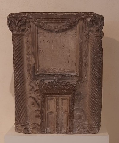 L’iscrizione, inserita impropriamente nella sezione Luca del Corpus Inscriptionum Latinarum (CIL XI, 1539), riporta la dedica del figlio, di un liberto e di una liberta (dal cognome grecanico) al “padre e ottimo patrono”. L’abbreviazione D.M. (“agli Dei Mani”) dovrebbe trovarsi all’inizio dell’epitaffio, mentre alla fine era piuttosto usuale scrivere B.M. (“a colui che lo meritò”). Tuttavia, una tabella sulla fronte di un sarcofago strigilato sempre proveniente da Roma, ma oggi conservato a Ventimiglia, presenta le stesse abbreviazioni D.M.D.D. all’ultima linea (CIL VI, 39013; datazione: fine II - inizi III sec. d.C.).
