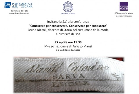 Venerdì 27 aprile, alle ore 15.30, sarà presentata al Museo nazionale di Palazzo Mansi la nuova catalogazione della collezione di costumi conservata a Palazzo. Si tratta di un percorso di studio realizzato dall'Università di Pisa e iniziato sotto la guida di Donata Devoti, una delle prime protagoniste dello studio dell’arte tessile lucchese, alla cui memoria è dedicata la collezione tessile del museo. La nuova catalogazione è a cura di Bruna Niccoli che ha coordinato gli studenti di Storia del costume e della moda, corso di laurea magistrale Storia e Forme delle arti visive, dello Spettacolo e dei nuovi media, di Pisa.