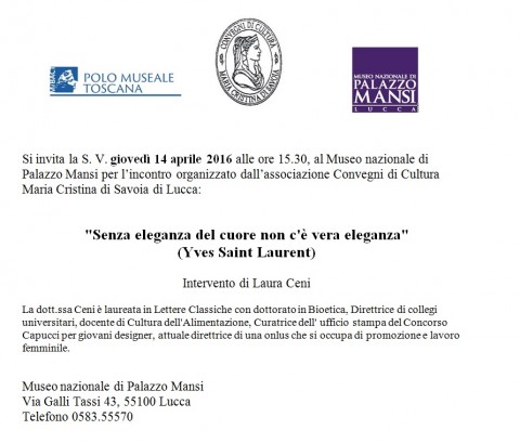 Si invita la S. V. giovedì 14 aprile 2016 alle ore 15.30, al Museo nazionale di Palazzo Mansi per l’incontro organizzato dall’associazione Convegni di Cultura Maria Cristina di Savoia di Lucca: